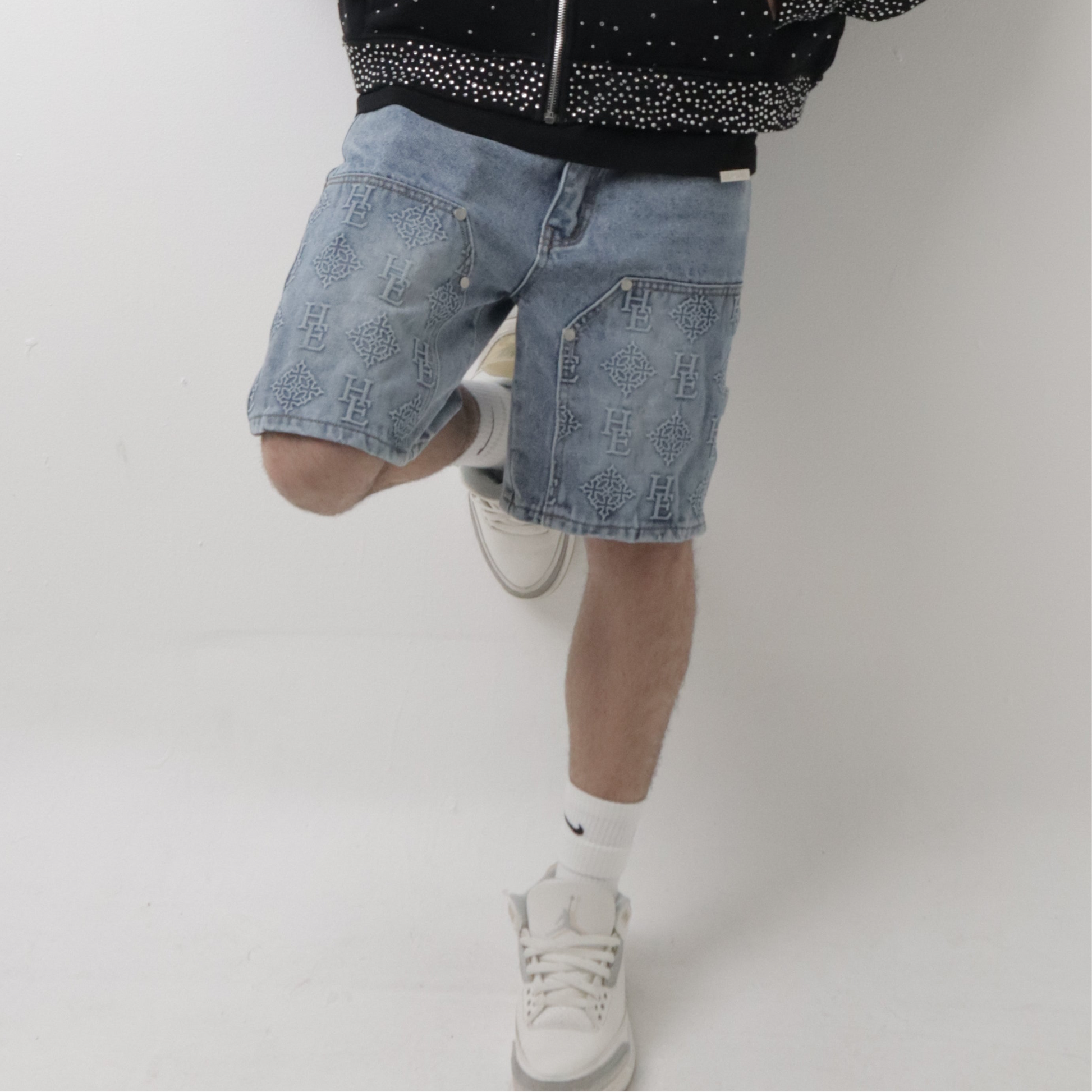 Crafted with premium denim, our Embossed Logo Jorts bring a bold edge to everyday wear. Featuring all-over embossed HE logos and signature cross motifs, these shorts stand out with a luxury streetwear feel.